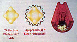 "Schlechtes Cholesterin" oder LDL wird mit Hilfe des "Klebestoffes" Lipoprotein(a) in den kleinen Rissen einer Arterienwand mit Vitaminmangel abgelagert. | ![]() |