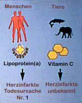 | "Warum kennen Tiere keinen Herzinfarkt?" Die Antwort lautet: Sie produzieren ihr eigenes Vitamin C (mit wenigen Ausnahmen), das für die Kollagenerzeugung und Stabilität ihrer Arterien ausreicht. Wir Menschen können kein Vitamin C produzieren und unsere Vorfahren waren jahrtausendlang für Skorbut anfällig. Da sie vom Aussterben bedroht waren, entwickelte ihr Körper biologische Reparaturmoleküle, um die durch den Vitaminmangel geschwächten Arterienwände instand zu setzen. | |||||